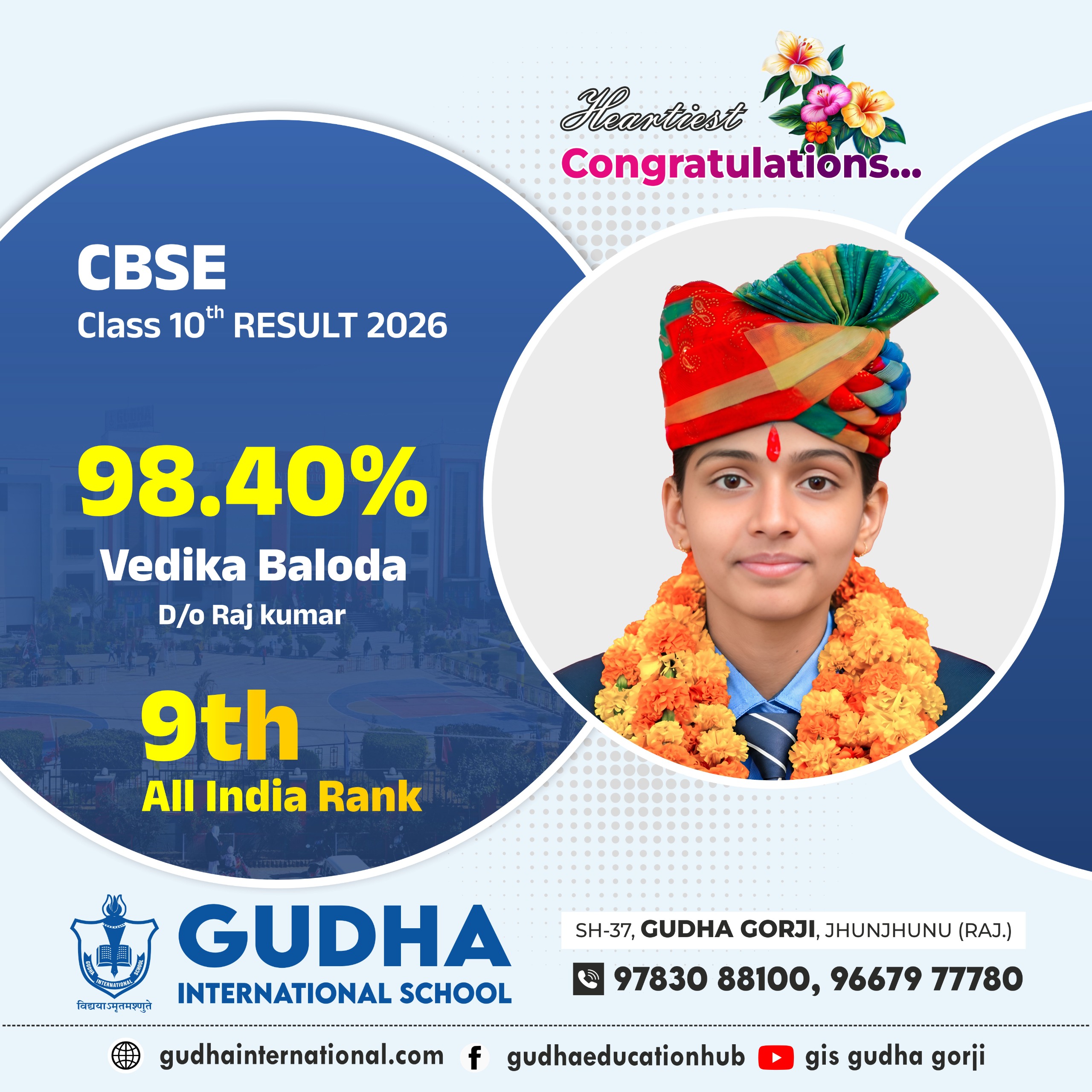 Gudha International’s Shining Star: Vedika Baloda Scores 98.40% in CBSE Class 10 result in the session 2025-26