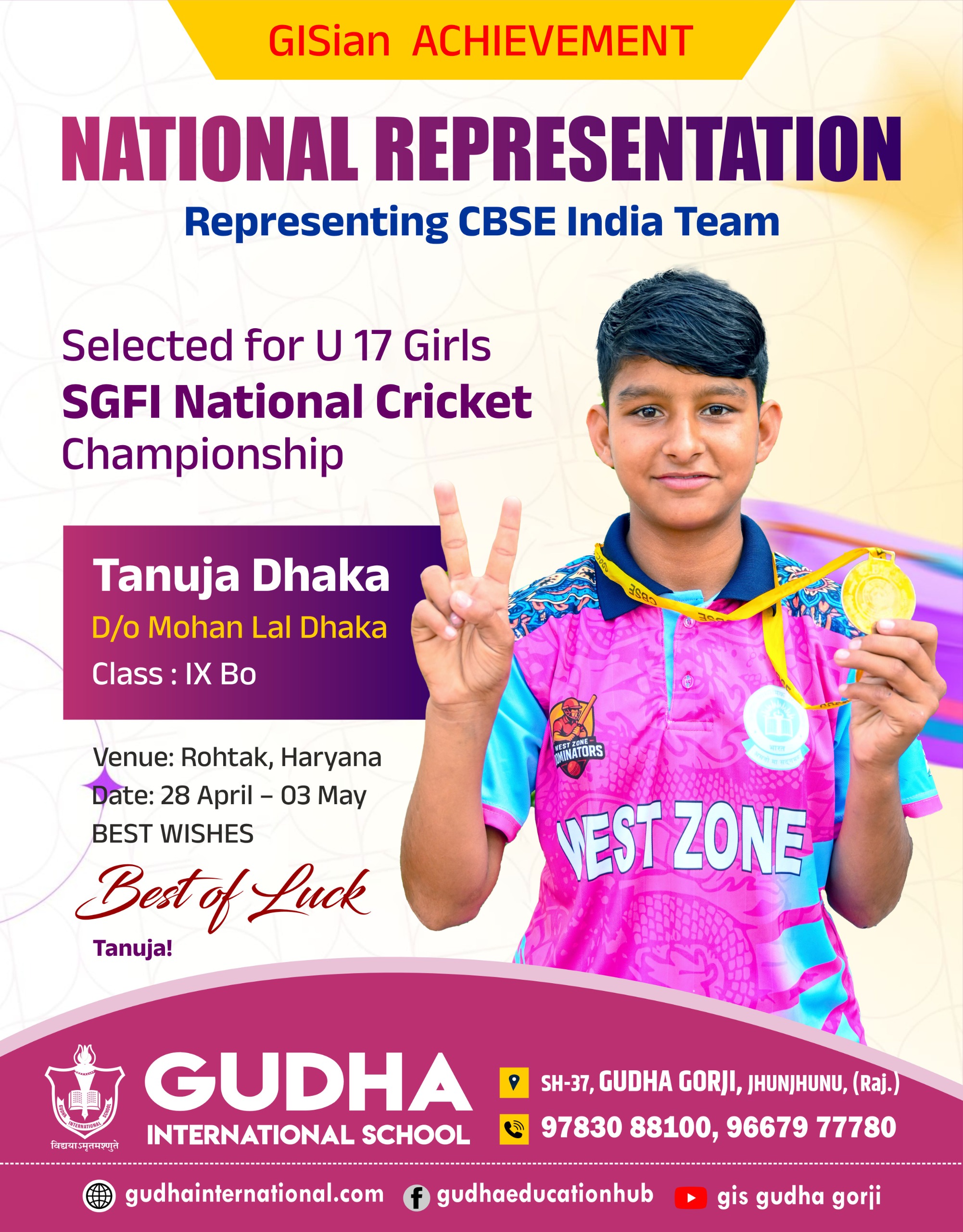 Selected for U-17 Girls SGFI National Cricket Championship